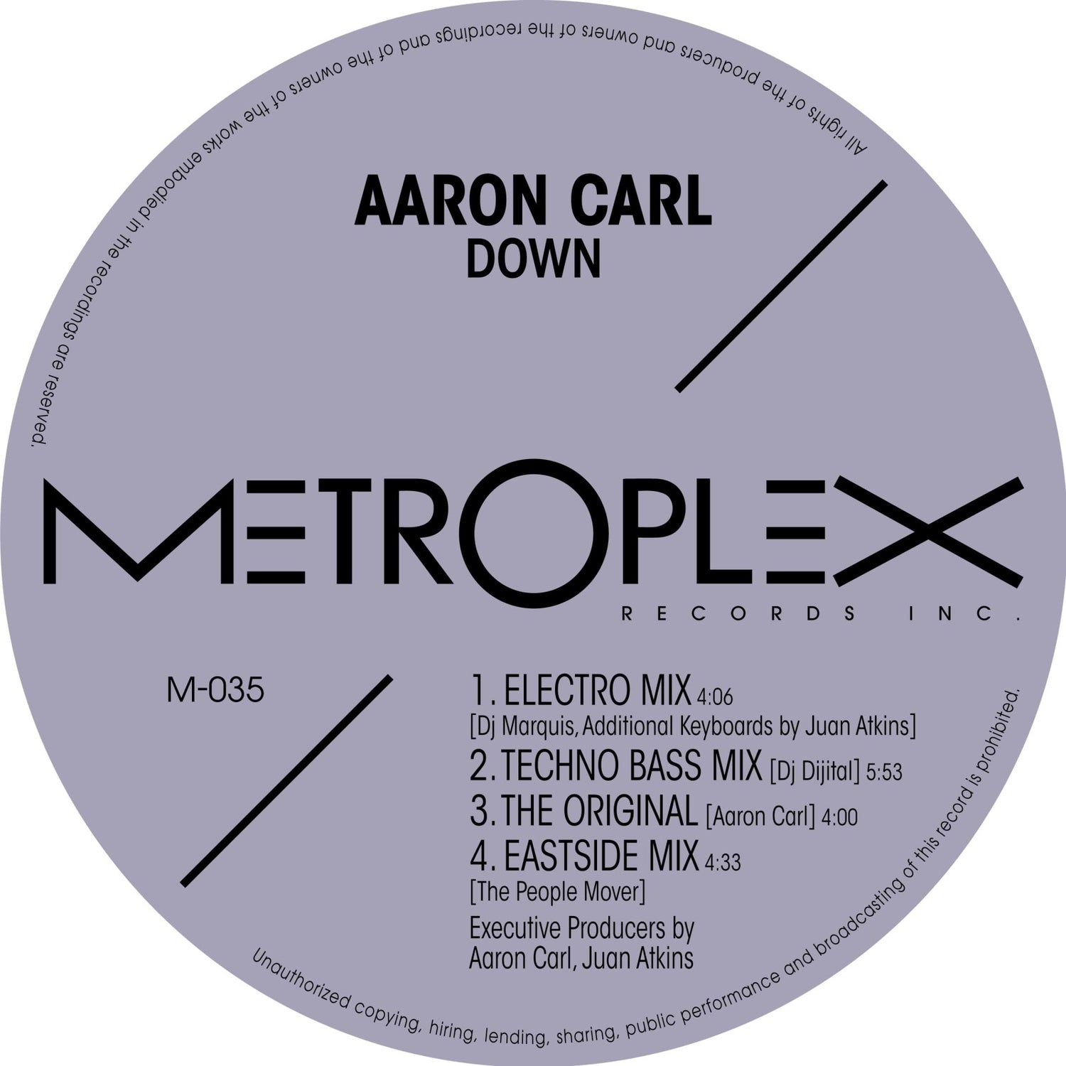 A well-timed remastered version of this killer jacking electro cut from Aaron Carl on the legendary Metroplex label, featuring none other than Juan "The Man" Atkins. The release includes four versions. Dirty, essential Detroit electro.