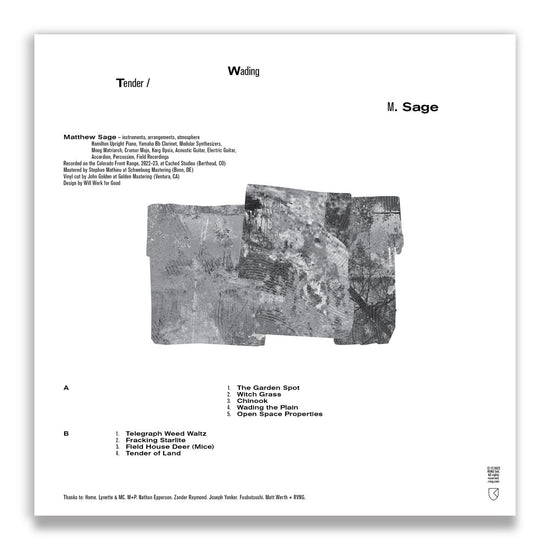 Tender / Wading finds Matthew Sage, aka M. Sage, in the foothills and pastures of Colorado, writing, recording, and returning to a patch of his homeland and identity, one act of sympathetic care informing the next. Constructed primarily on piano and clarinet, and then embellished with guitar, modular synthesizer, percussion, and field recordings captured around the perimeter of his home, the album is a sweeping, serene vision of vitality, radical softness, and the reassuring sense of coming home, even if home has changed.